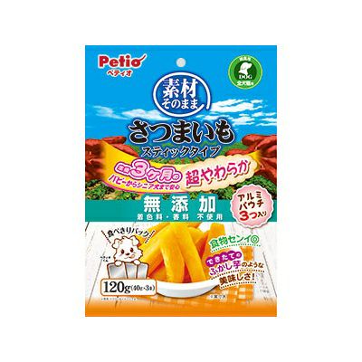 食物センイやビタミンC・Eなど栄養たっぷりのさつまいもをレトルト調理で超やわらかに仕上げました。パピーからシニア犬まで安心の食感とできたてホクホクのふかし芋のような美味しさ!温めてさらに美味しく、暑い日には冷やしたり凍らせても◎食べごたえのあるスティック形状。着色料・香料無添加。アルミパウチ3つ入り。