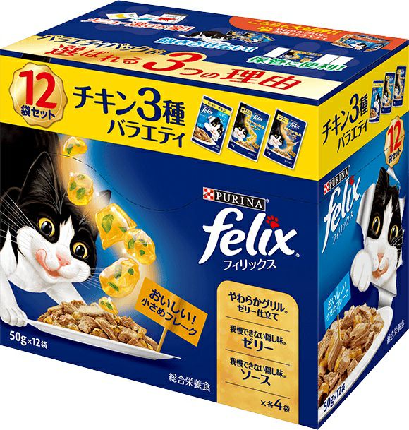 肉類(チキン、ビーフ、家禽ミール 等)、小麦たんぱく、鶏脂(オメガ6脂肪酸源)、ぶどう糖、アミノ酸類(タウリン)、ミネラル類(Ca、P、K、Na、Cl、Mg、Fe、Cu、Mn、Zn、I)、増粘多糖類、ビタミン類(A、D、E、K、B1、B2、パントテン酸、ナイアシン、B6、葉酸、ビオチン、B12、コリン)