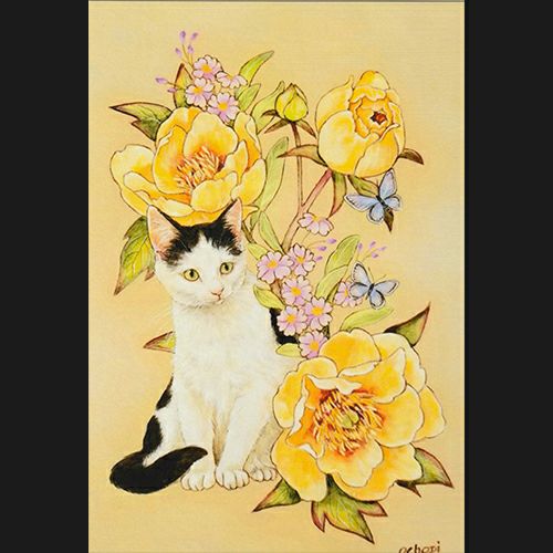 ポストカード 「黄色い牡丹と富士額猫」 【同梱A】