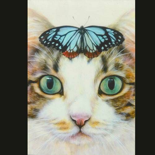 鮮やかな蝶々の青と、猫の宝石のような瞳の輝きから目が離せません。