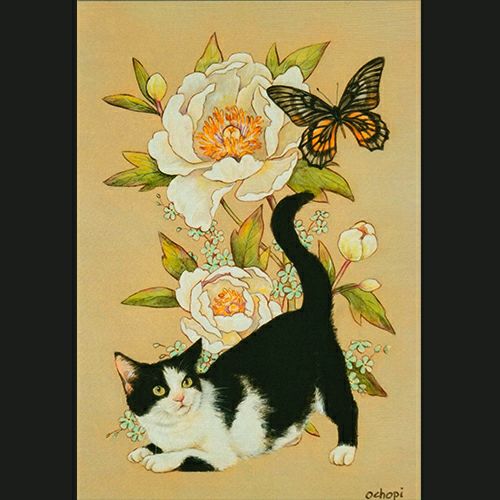 ポストカード 「白い牡丹とハチワレ猫」 【同梱A】