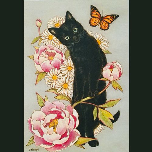 ポストカード 「ピンクの牡丹と黒猫」 【同梱A】