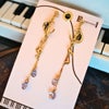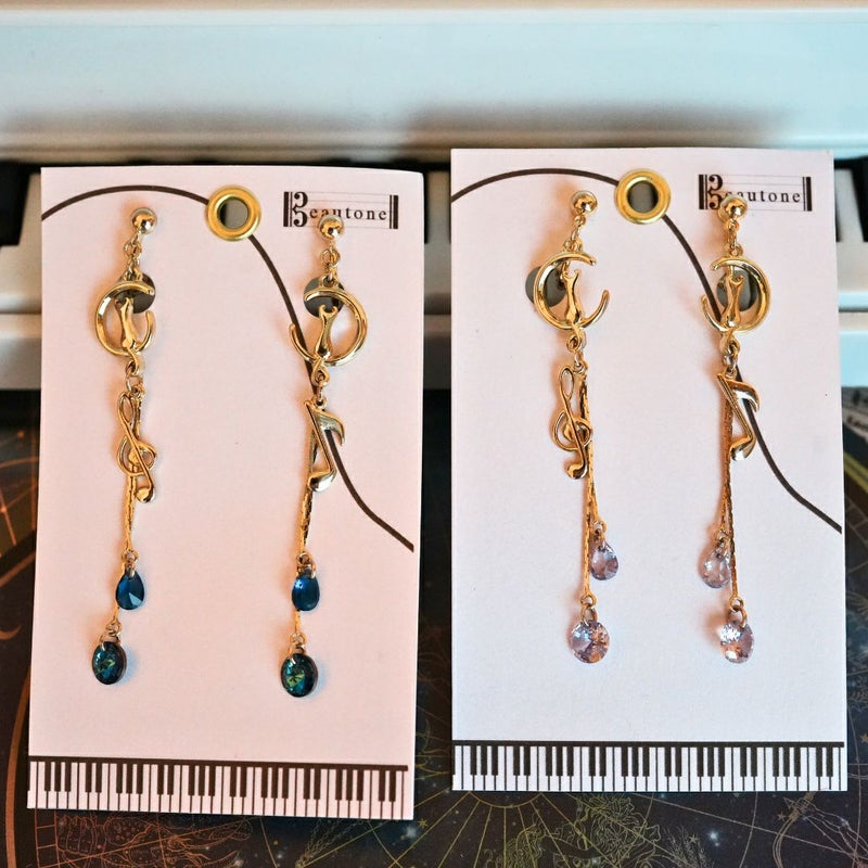 月に乗った猫と、キラキラ輝くジルコニアと音符モチーフが揺れる、可愛いデザインです