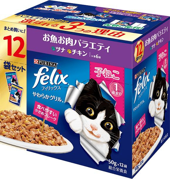 肉類(チキン、ビーフ、家禽ミール 等)、小麦たんぱく、魚介類(ツナ 等)、鶏脂、ぶどう糖、アミノ酸類(タウリン)、ミネラル類(Ca、P、K、Na、Cl、Mg、Fe、Cu、Mn、Zn、I)、増粘多糖類、ビタミン類(A、D、E、K、B1、B2、パントテン酸、ナイアシン、B6、葉酸、ビオチン、B12、コリン)、着色料(酸化鉄)
