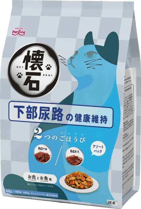 「熟成かつお」と「熟成まぐろ」をそれぞれトッピングした分包入り。下部尿路の健康維持に配慮して、ミネラルやアミノ酸を調整し尿を弱酸性化。