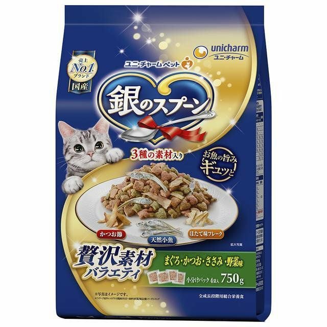 穀類(トウモロコシ、コーングルテンミール、小麦粉、パン粉)、肉類(チキンミール、ポークミール、ビーフミール、チキンエキス)、魚介類(フィッシュミール、乾燥小魚、フィッシュエキス、かつお節、煮干パウダー、かつおミール、まぐろミール、白身魚ミール)、動物性油脂、ビール酵母、まぐろ風味焼カマボコ、酵母エキス、野菜類(ニンジンパウダー、カボチャパウダー、ホウレンソウパウダー)、ミネラル類(カルシウム、塩素、コバルト、銅、鉄、ヨウ素、カリウム、マンガン、リン、亜鉛)、アミノ酸類(タウリン、メチオニン)、ビタミン類(A、B1、B2、B6、B12、C、D、E、K、コリン、ナイアシン、パントテン酸、ビオチン、葉酸)、着色料(二酸化チタン、赤色102号、赤色106号、黄色4号、黄色5号、青色1号)、調味料、酸化防止剤(ミックストコフェロール、ハーブエキス)