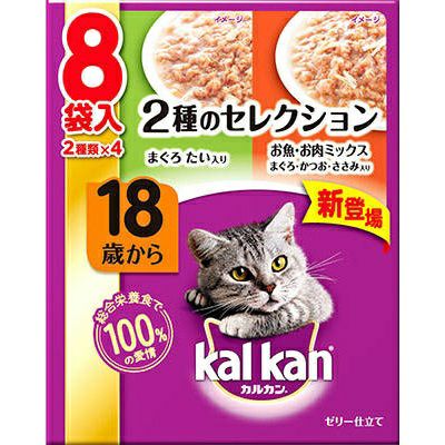 好評な2種類の味のセレクション。まぐろ・たい入り、まぐろ・かつお・ささみ入りは、厳選された素材をカルカン特製だしで煮込み、ジューシーなゼリー仕立てにしました。18歳以上の猫に必要な栄養素がバランスよく含まれた総合栄養食です。食べやすい小さめのフレーク。