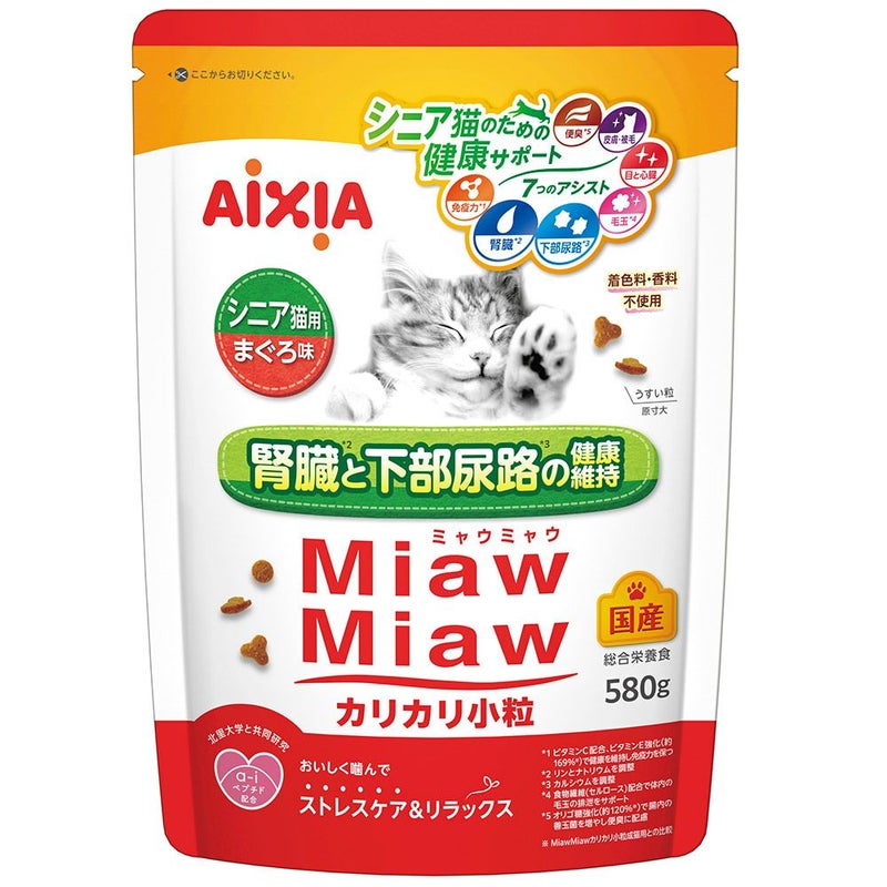 「a-iペプチド」と「DMHF」含有の粒を噛むことで、愛猫の心の健康維持をサポート。シニア猫の腎臓の健康維持に配慮してリンとナトリウムを調整。下部尿路の健康維持に配慮して、カルシウムを調整し尿石の形成に配慮。食物繊維(セルロース)が体内の毛玉の排泄をサポート。目と心臓の健康維持をサポートするタウリンを配合。健康を維持し免疫力を保つビタミンCを配合、ビタミンEを強化(約169%※)。 不飽和脂肪酸のバランスを調整して、皮膚と被毛の健康維持をサポート。うすく仕上げた粒で食べやすい。着色料、香料不使用の国産品。 ※MiawMiawカリカリ小粒成猫用との比較