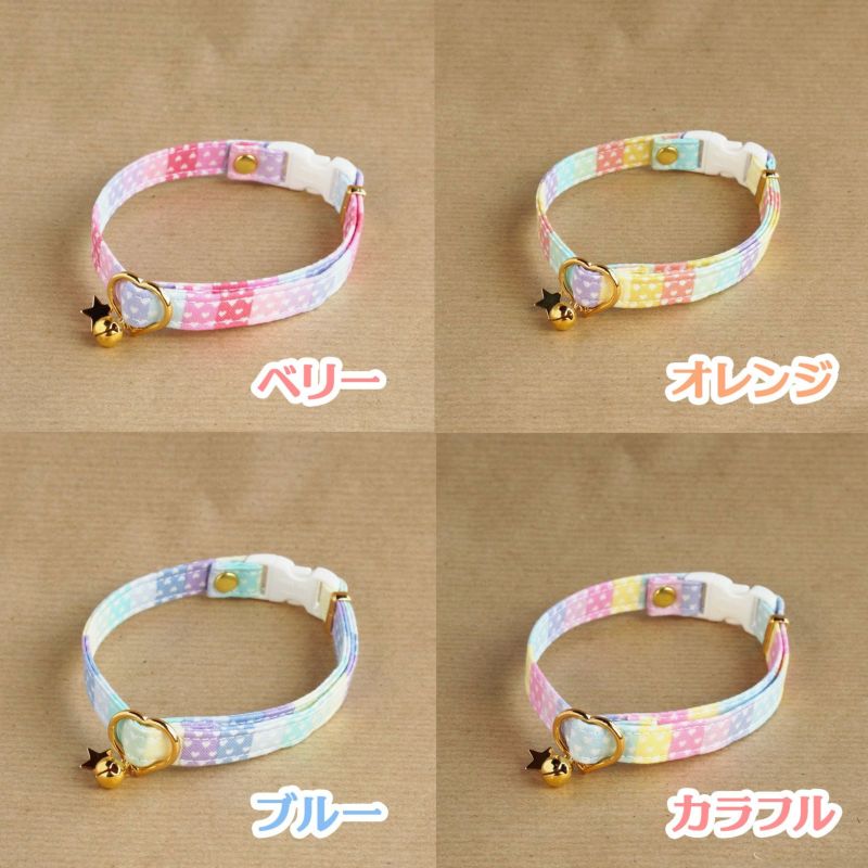 パステルなレインボーカラーに、白のハートドットが組み合わされた、キュートなプリントの首輪です。