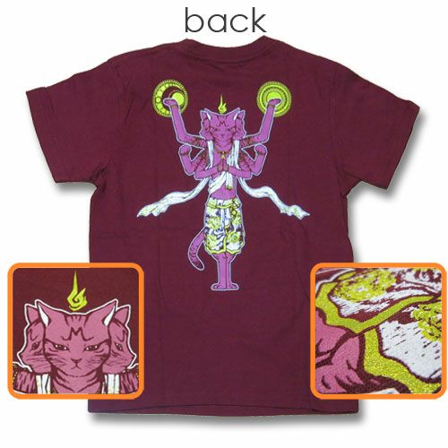 怒りに燃え立つ真っ赤な身体を持つ鬼神でありながら、憂いを秘めたその表情を猫モチーフで再現。左右の掌に宿る日論・月輪をはじめ、随所にゴールドインク使用でゴージャスです。