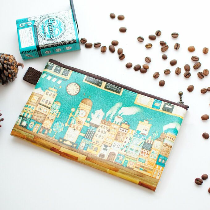 「カフェの奥のコーヒーの街」がモチーフの平のポーチです。