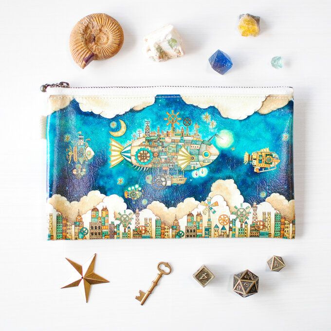 「空飛ぶ魚の街」がモチーフの平のポーチです。