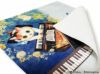 グランドピアノを弾く猫ちゃん。青いインコ、リスも演奏を聴きにきています。落ち着いた色合い、お洒落なデザインのタオルです。