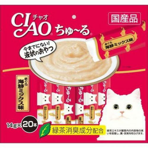 ・原材料…まぐろ、ほたてエキス、かつお節エキス、まぐろエキス、糖類(オリゴ糖等)、植物性油脂、増粘剤(加工でん粉)、増粘多糖類、ミネラル類、調味料(アミノ酸等)、ビタミンE、緑茶エキス、紅麹色素、約7kcal/本