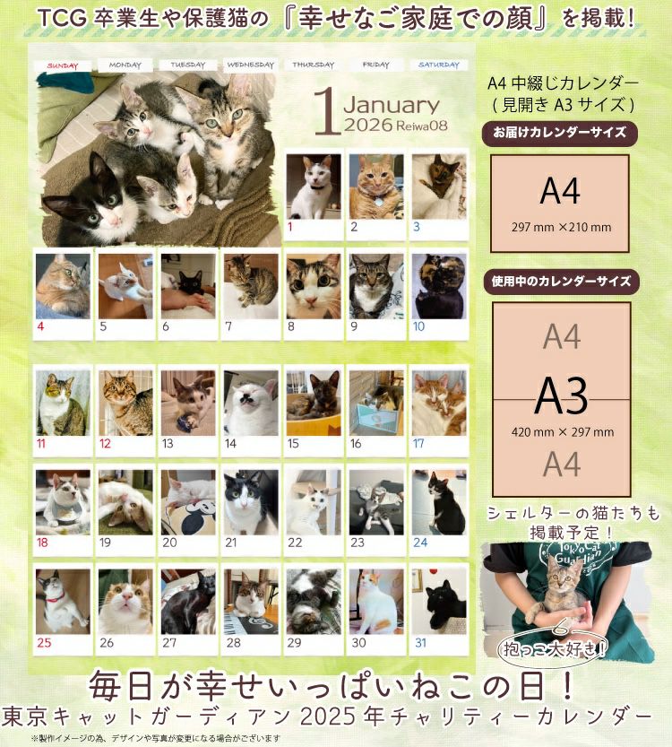 他の画像を見る シェルターの卒業生・保護猫さんで綴る365日 東京キャットガーディアン 2026カレンダー 猫カレンダー 見開きA3サイズ ペット 保護猫 新作カレンダー【同梱A】 販売価格 ¥ 1,980 税込 販売期間 2025/11/01 12:00 〜 カートに入れる お気に入りに登録する